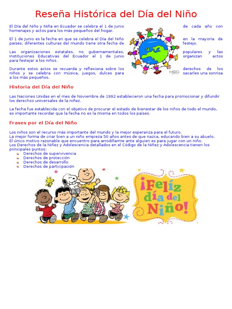 El 1 ero de junio se estableció el día del niño en la asamblea general de las naciones unidas. El día del niño es una fiesta que se celebra a nivel internacional pero en cada país es un día diferente. El día de la amazonía ecuatoriana. La definición de el niño costero fue creada por el enfen de perú para estudiar el fenómeno y prevenir los daños en ese país, explicó a bbc mundo rodney martínez, director del centro internacional para la investigación del fenómeno de el niño (ciifen), ubicado en ecuador. No todo esta perdido cuando puedes ver en el rostro de un nino su magnifica sonrisa.